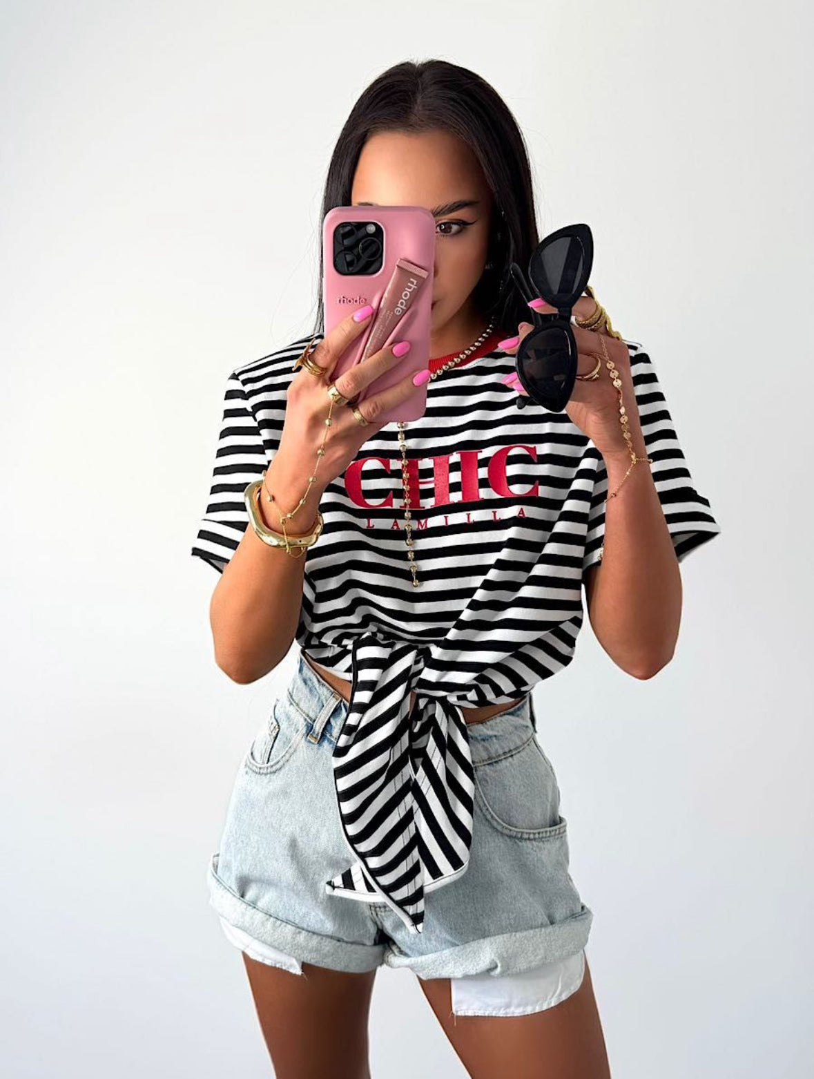 Bluzka z wiązaniem w czarno-białe paski z czerwonym napisem. Rozmiar uniwersalny.
