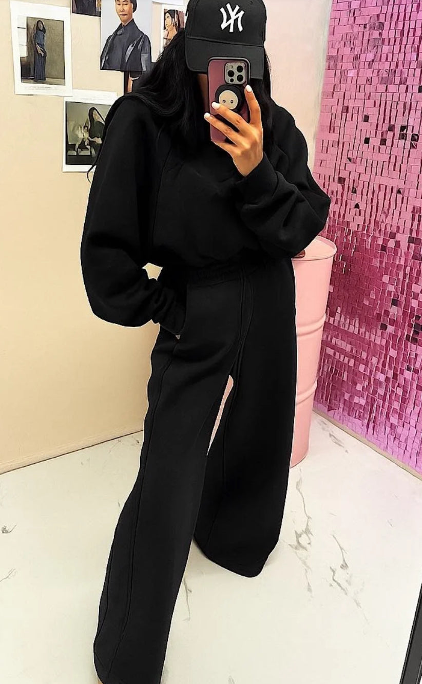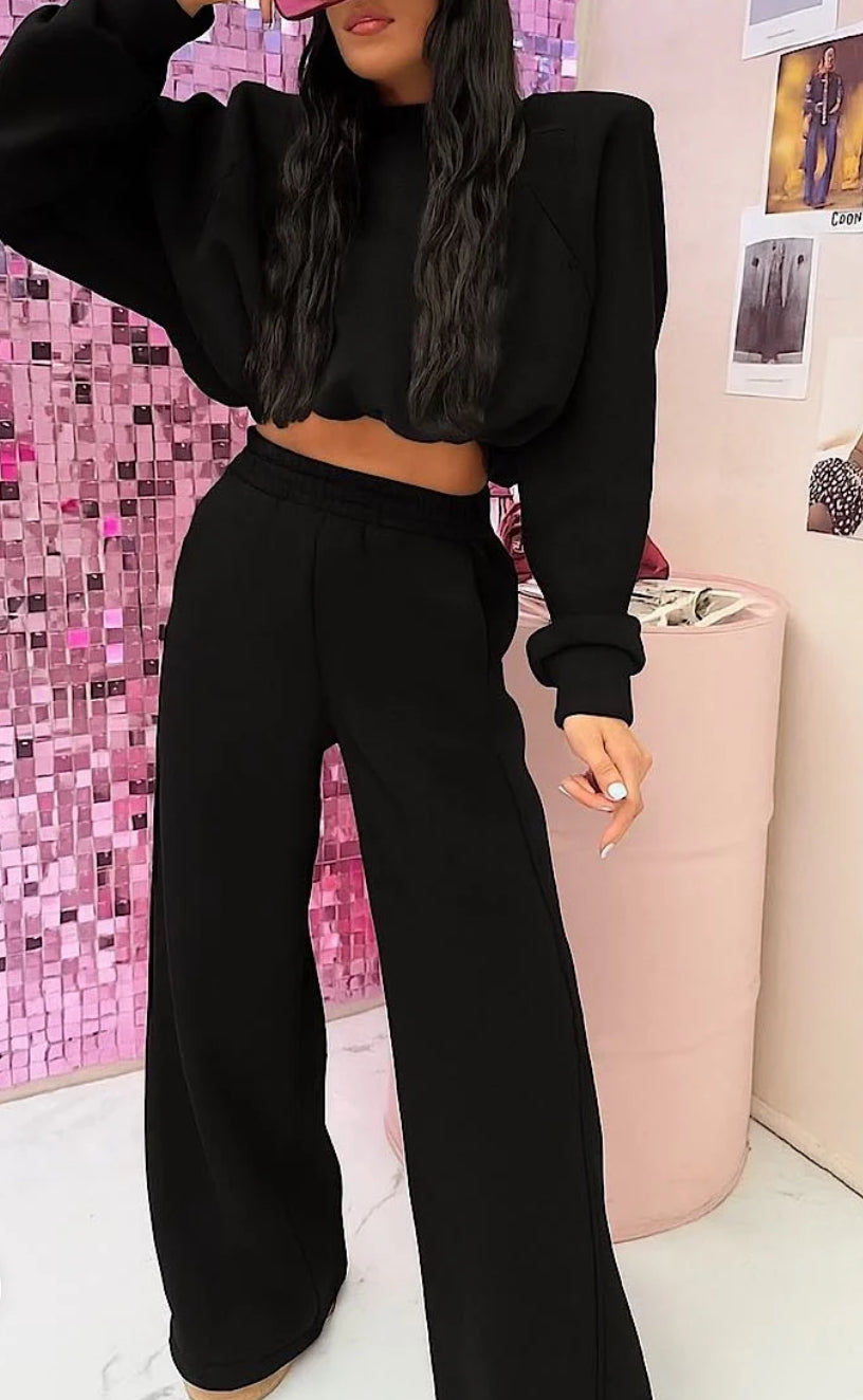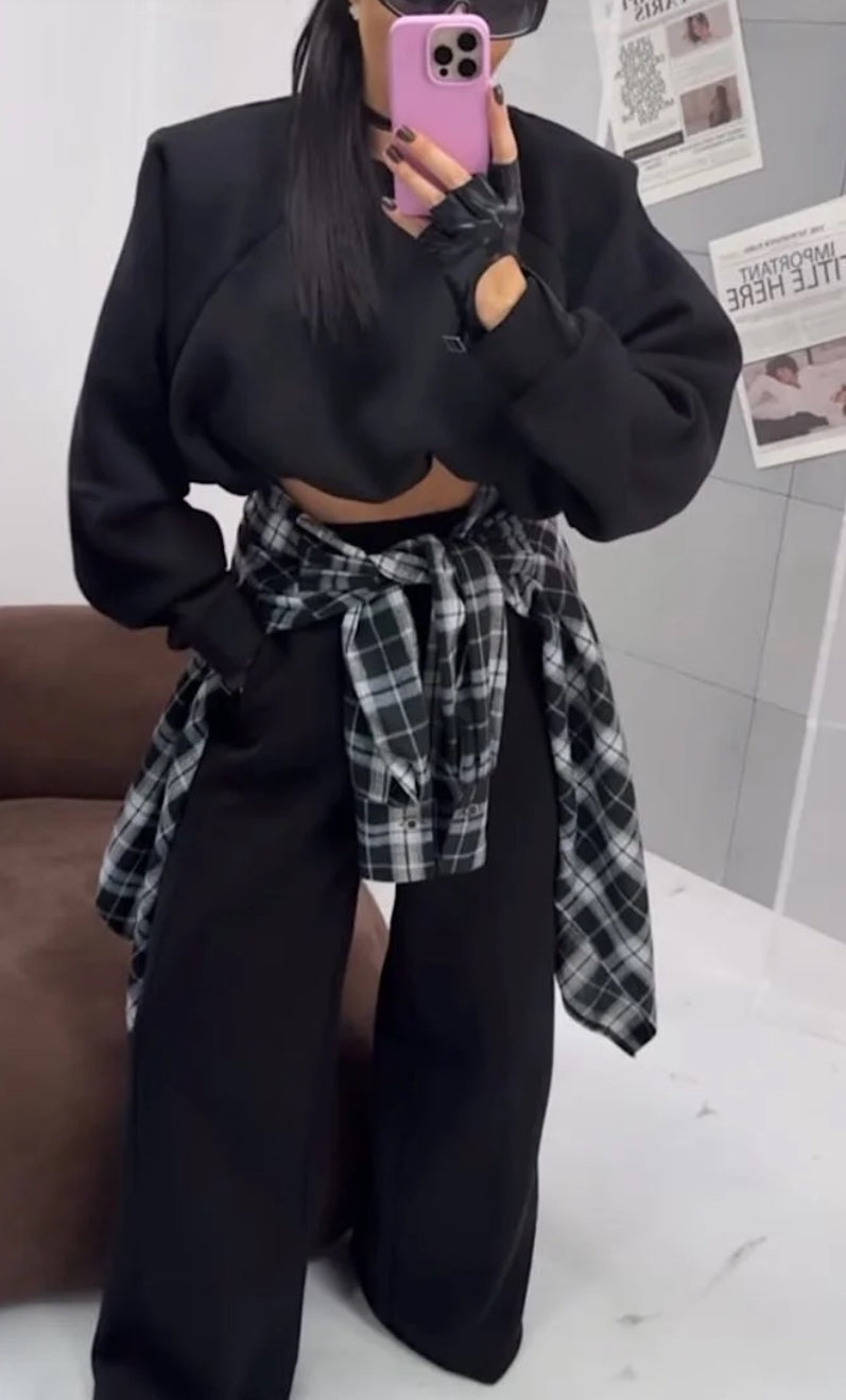 Komplet dresowy, w skład którego wchodzi bluza z poduszkami i ściągaczem oraz spodnie z szeroką nogawką.