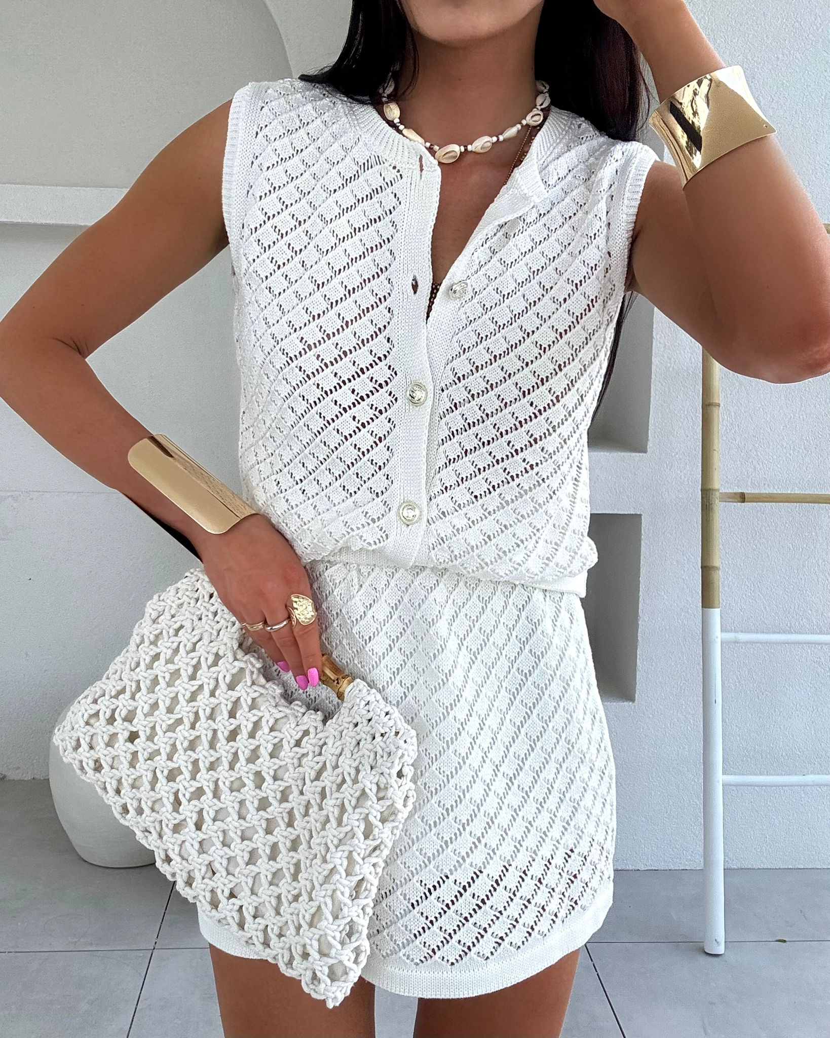 Komplet firmy LaMilla uszyty z dzianiny ażurowej o geometrycznym wzorze. Komplet składa się z krótkiej spódniczki na gumie i sweterka ozdobionego guzikami.