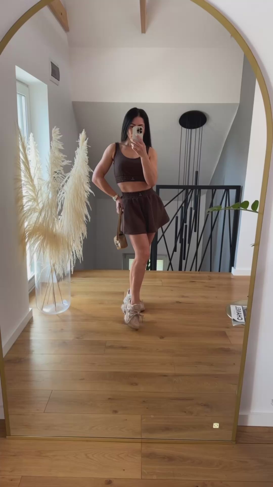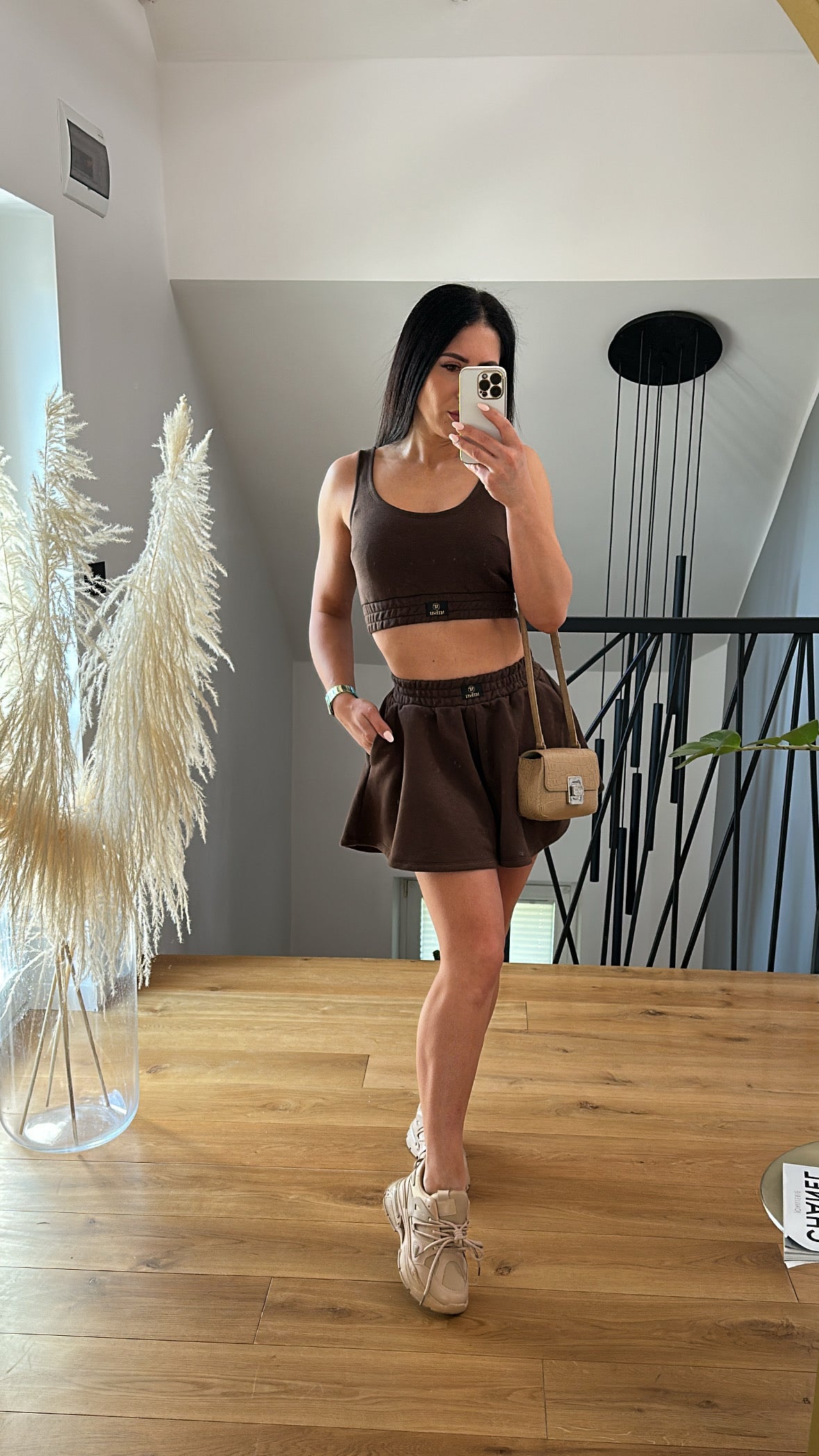 Zestaw składa się z topu i spodenek, które idealnie podkreślają talię. Dostępny w kolorze różowym, brązowym i czarnym.