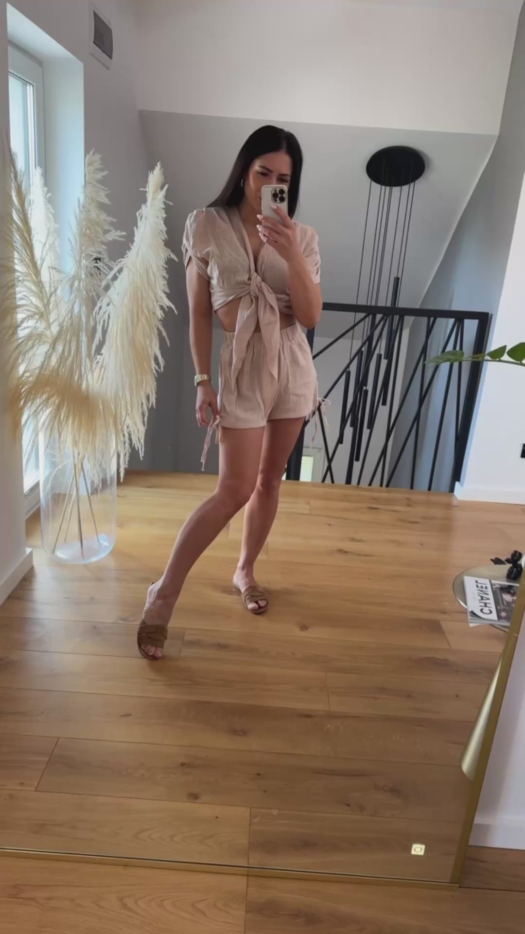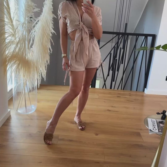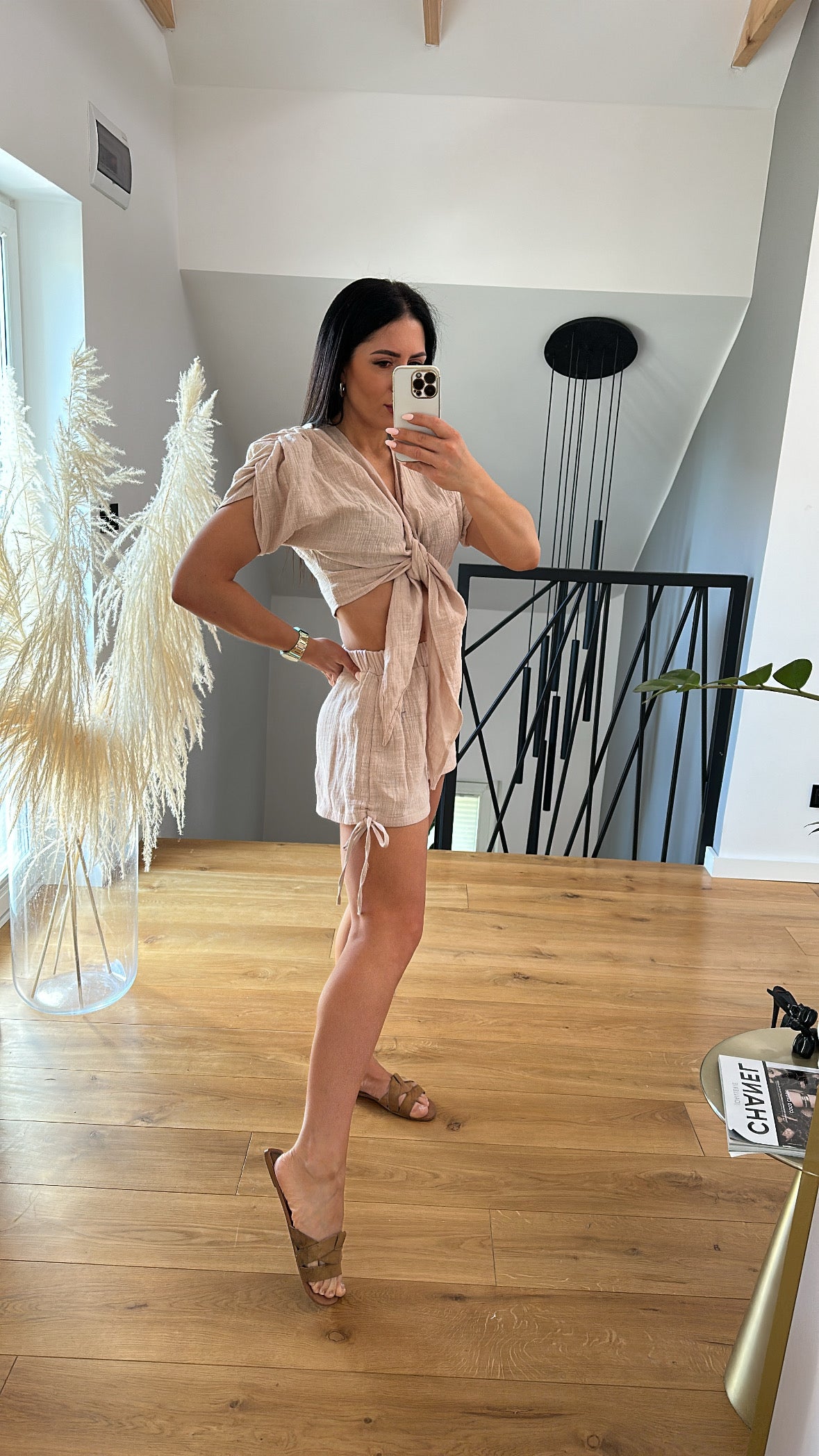 Top + spodenki z marszczenie materiału. Top regulowany wiązaniem. Ściągacze po boku spodenek.
