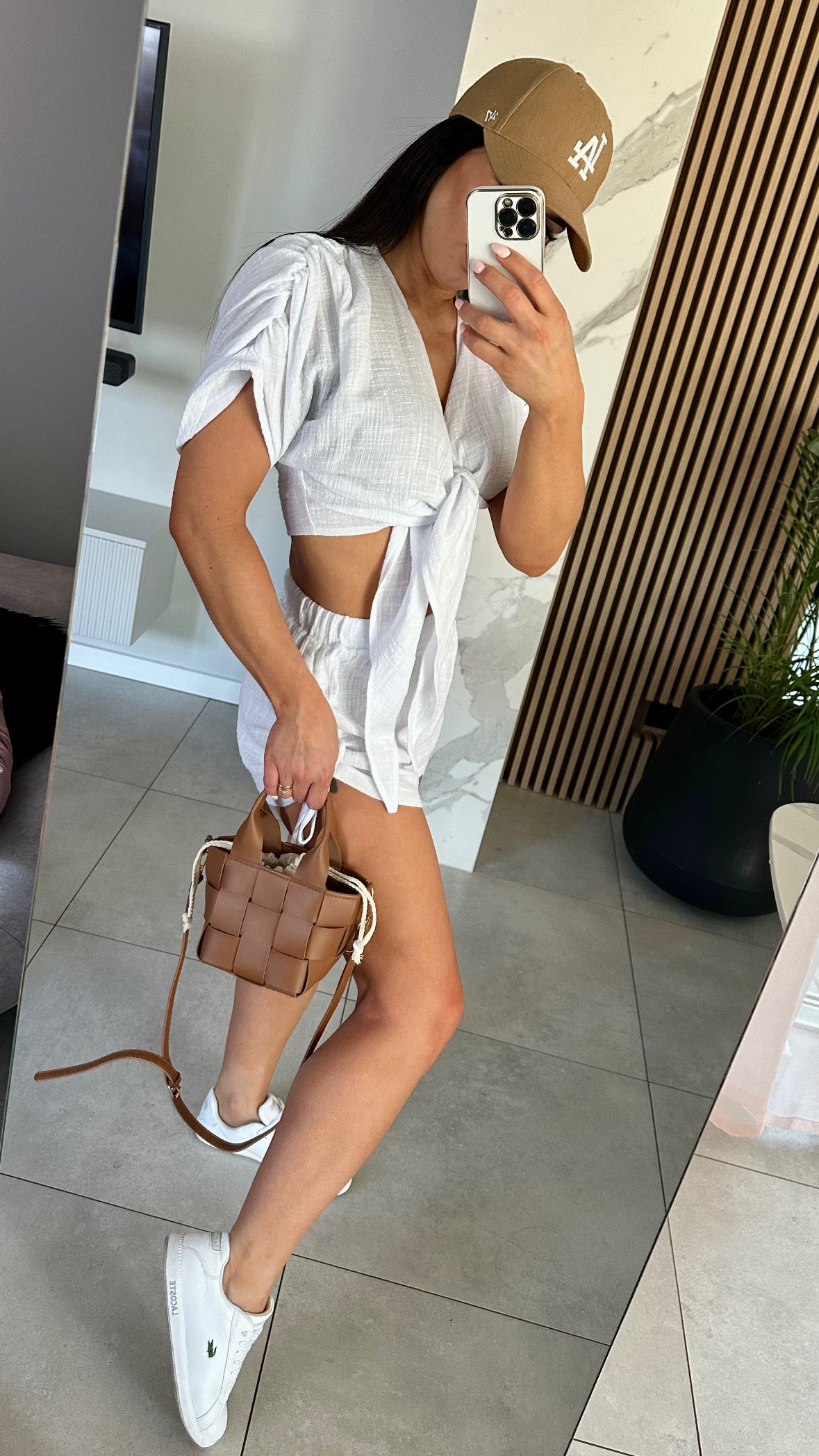 Top + spodenki z marszczenie materiału. Top regulowany wiązaniem. Ściągacze po boku spodenek.