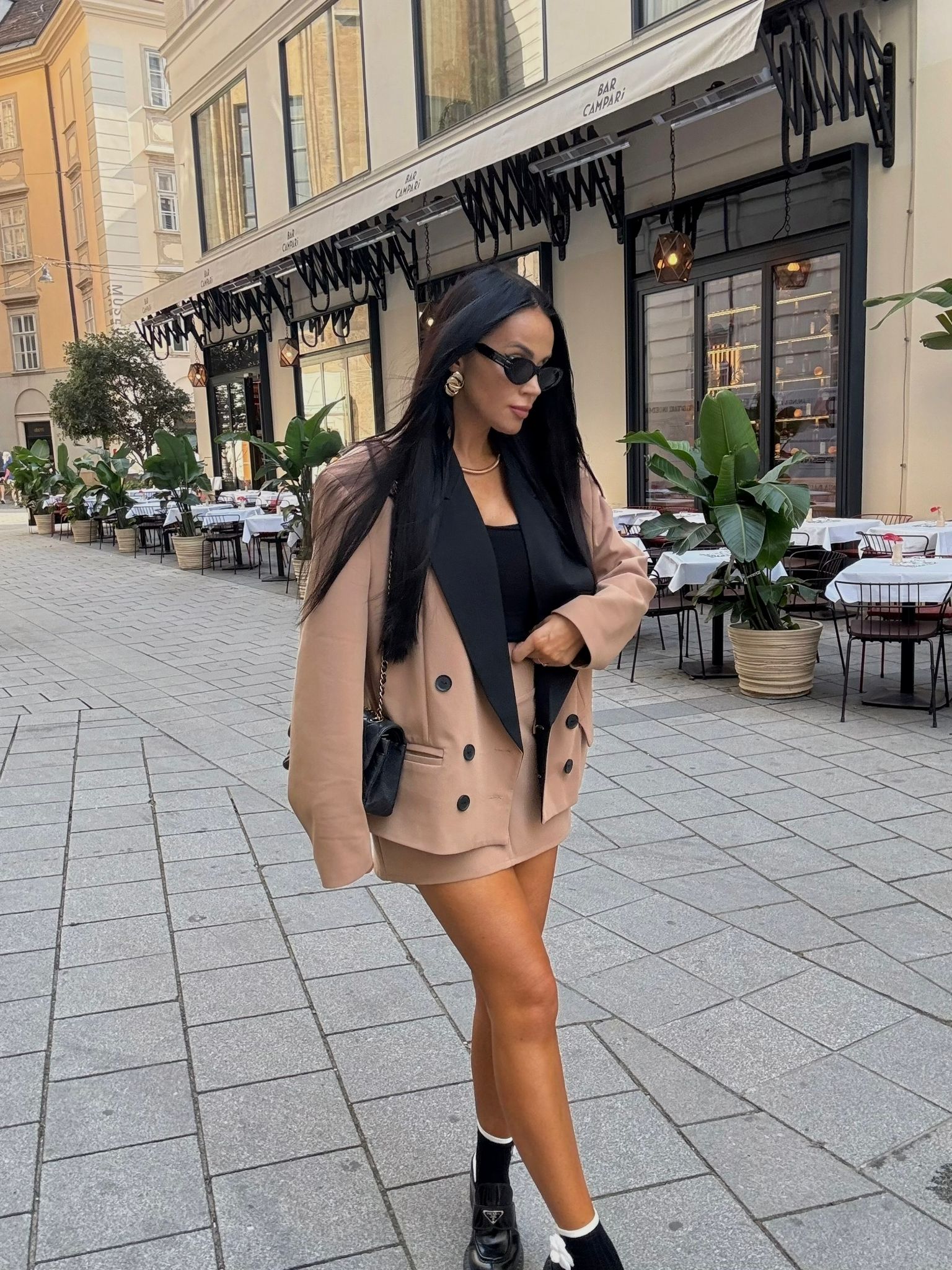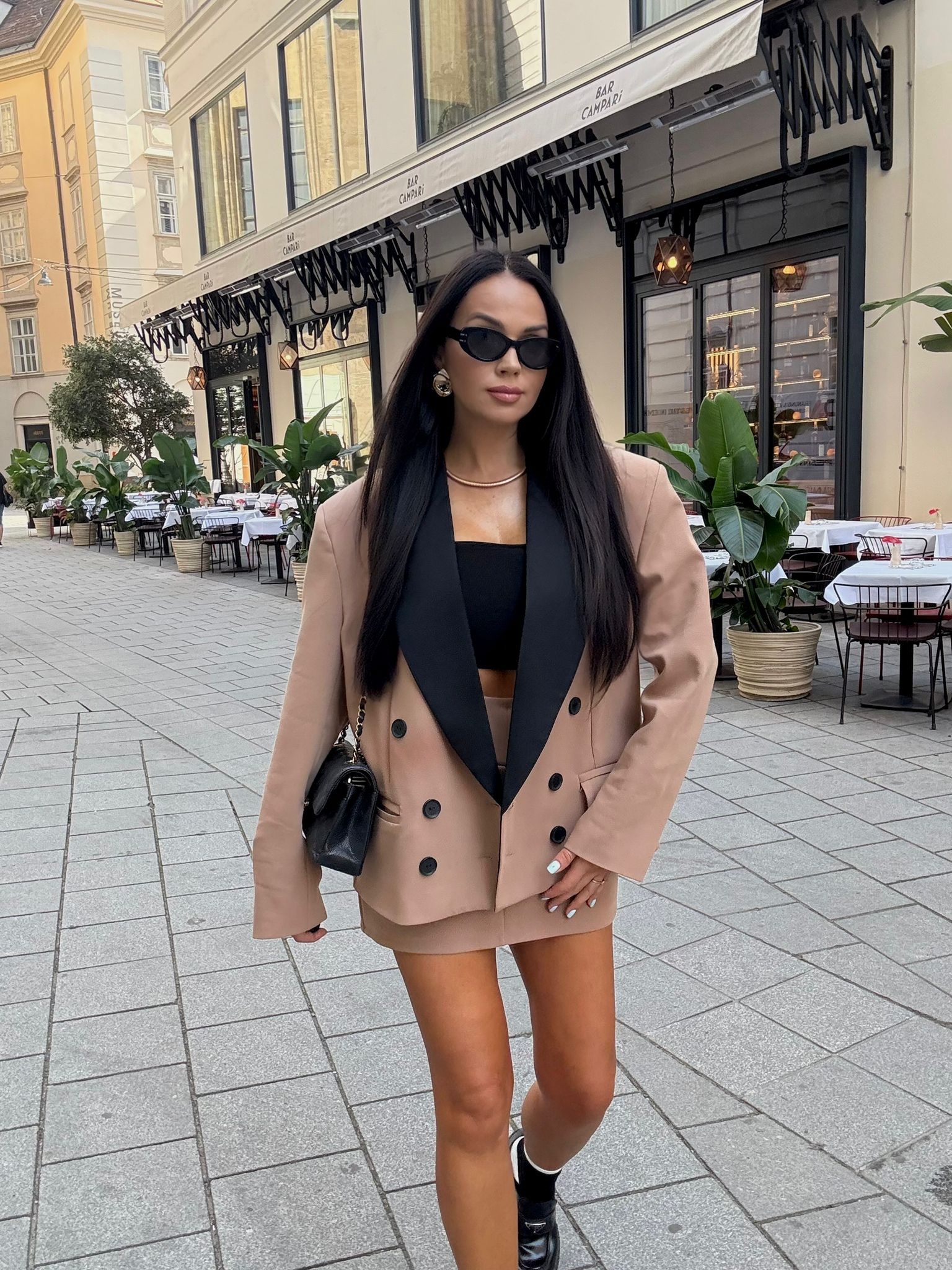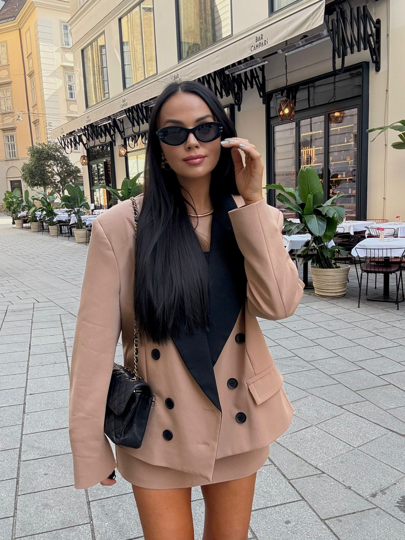 Marynarka o prostym kroju w ciekawym zestawieniu kolorystycznym. Idealnie pasuje do beżowych lub czarnych „dołów”.