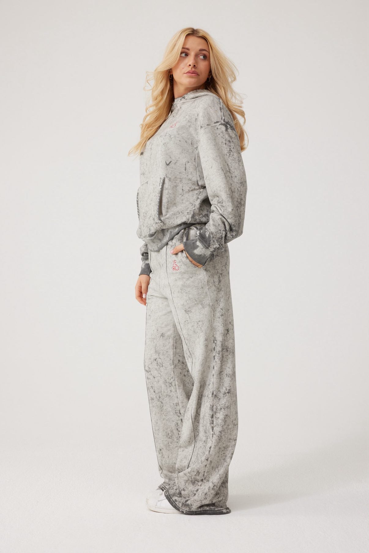 Luźne dresowe spodnie w kolorze spranej szarości z szeroką nogawką i wysokim stanem.