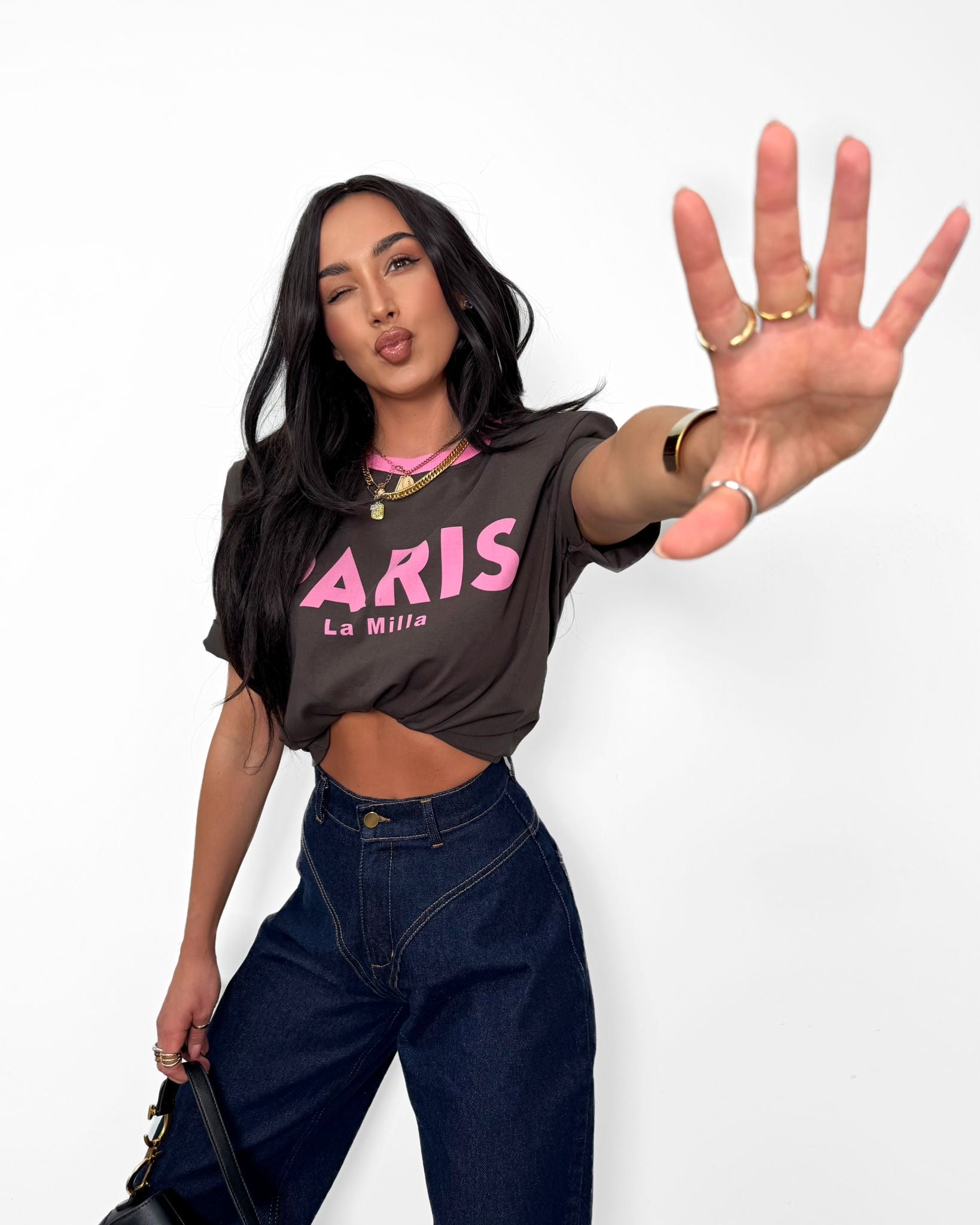 T-shirt Paris La Milla - brązowy z różowym napisem